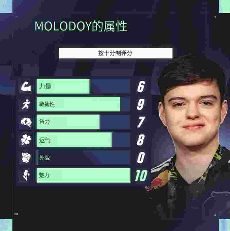 molodoy认为自己是一个有魅力且运气相当不错的人。与此同时,他对自己的外貌评价十分苛刻,仅给出了0分。目前暂未提及他给出如此低评分的具体原因。