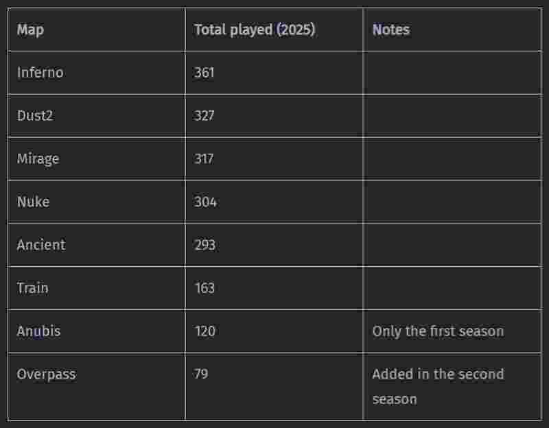 在2025年IEM卡托维兹站、2025年BLAST.tv奥斯汀Major、EPL S22等赛事中,Train要么位列出场率末位,要么处于出场率最低的梯队之中。即便偶尔登场,也大多是地图禁用环节随机结果所致,而非战队主动且有把握地选择。