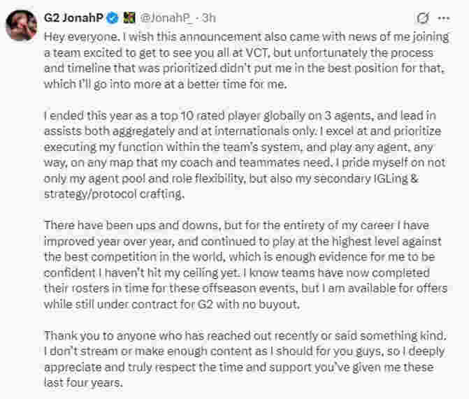 大家好。我本希望这次公告能同时带来我加入新战队并将在VCT与各位见面的好消息,但遗憾的是,整个流程和时间安排并未给我创造最有利的条件,具体细节我会在更适合的时机详细说明。