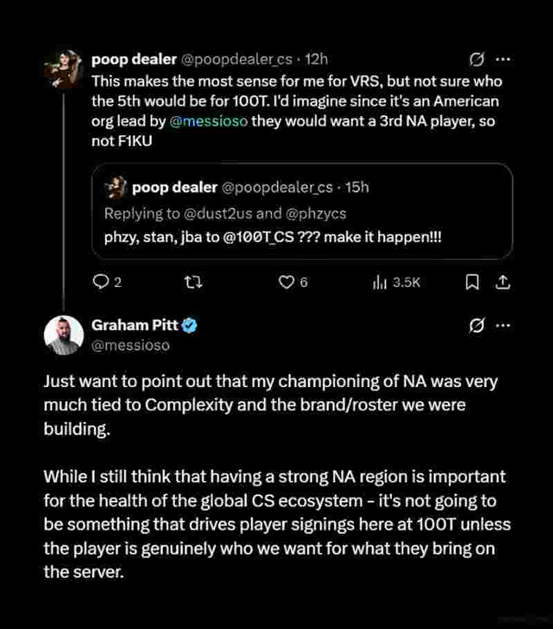 100 Thieves俱乐部CS部门负责人messioso在谈及北美选手签约问题时表示,他们不会优先考虑北美赛区。