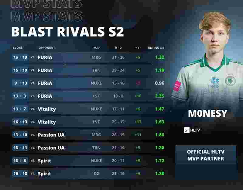 在BLAST对抗赛S2赛事期间,m0NESY带领队伍出战了十张地图,其中仅在总决赛对阵