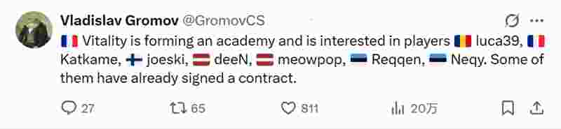 “Vitality正在组建青训队,有意签下以下选手:罗马尼亚选手luca39、法国选手Katkame、芬兰选手joeski、拉脱维亚选手deeN以及meowpop、爱沙尼亚选手Reqqen以及Neqy。其中部分选手已签署合约。”