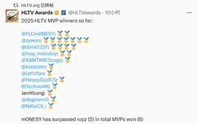 而大魔王ZywOo和donk分别为七块和四块MVP奖牌。即将到来的布达佩斯Major将决出今年最后一块,同时也是含金量拉满的一块赛事MVP奖牌。