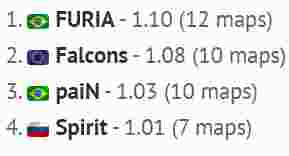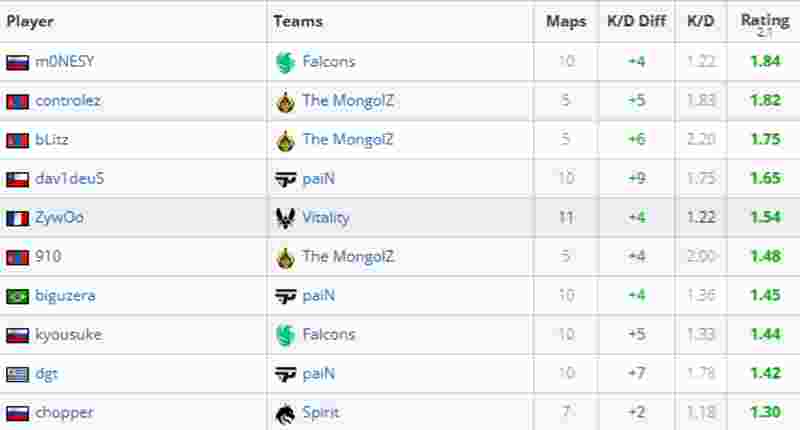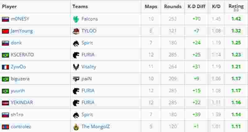 Falcons选手m0NESY,他在10张地图上有着1.42的rating;第二名JamYoung为6张地图1.32 rating;第三名donk为7图1.25。