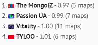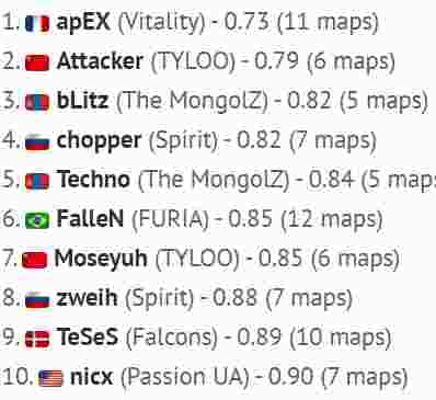 Vitality的队长apEX是rating最低的选手,仅为0.73。排名稍高一点的是本次赛事中唯一的丹麦选手TeSeS,他的rating值为0.89,中国队