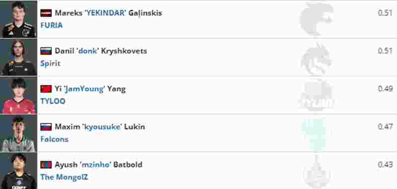 Spirit选手donk和YEKINDAR的数据一致,均为0.51;第三名是