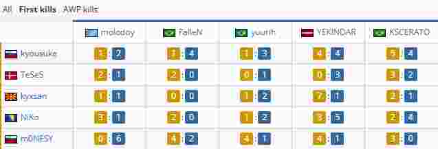 首杀对位数据上,YEKINDAR为队伍拿下14个首杀,molodoy和KSCERATO各拿下11个首杀。Falcons一方最多的首杀选手是m0NESY,为15个首杀。