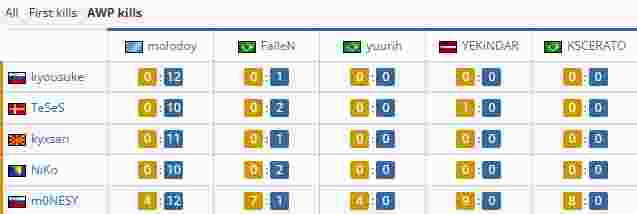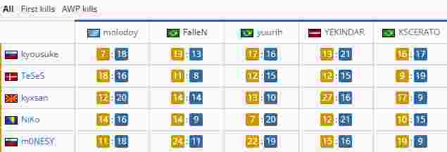 在全部对位数据上,FURIA战队选手molodoy展示出了自己强大的威慑力,除了面对TeSeS(16-18)略居下风之外,剩下的Falcons选手都不能给molodoy带来太多压力。尤其是kyousuke和m0NESY两位枪男面对molodoy对位数据惨淡,NiKo也仅有14-16的对位数据。