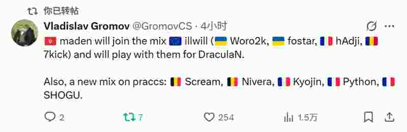 “Maden将加入混合战队illwill,队友包括Woro2k、fostar、hAdji、7kick。他们会参加DraculaN赛事。
