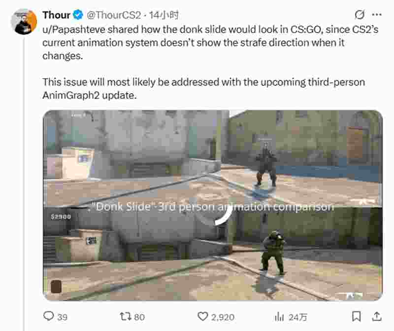 日前数据挖掘者ThourCS转载了Reddit用户Papashteve的相关视频,后者展示了第三人称下CSGO和CS2人物角色滑步的动画区别。