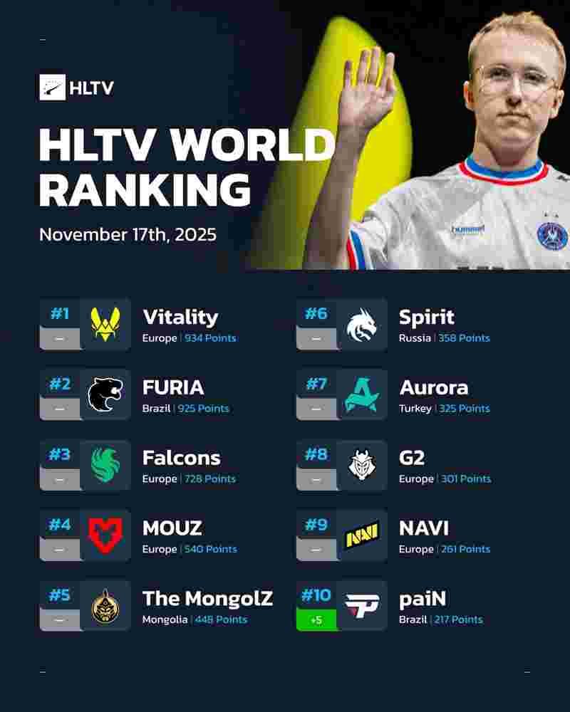 今天凌晨HLTV更新了旗下世界排名。相比于之前的排名,本次排名变动幅度不大。刚刚结束的BLAST对抗赛S2的结果并没有对榜单带来太大的撼动。