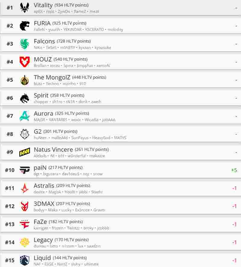 paiN战队,凭借在香港的出彩表现,他们的排名进步五位来到第十。