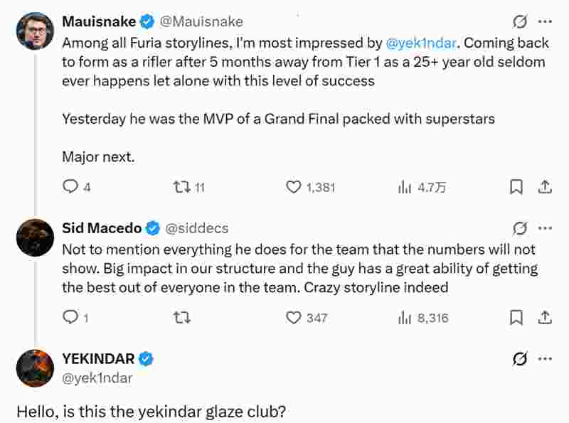 FURIA战队教练sidde盛赞YEKINDAR为战队成功所做的贡献。在Mauisnake称赞了YEKINDAR的状态之后,sidde在评论区表示YEKINDAR“拥有一种惊人的能力”。