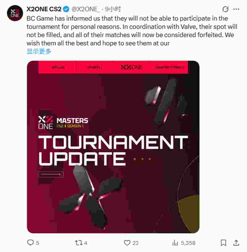 “BC.Game战队告知我们,因个人原因无法前来参赛。经与Valve协商,该战队的参赛名额将不再递补,其所有参赛场次均按负场处理。我们祝愿这支战队一切顺利,并期待在未来的赛事中与他们重逢。”