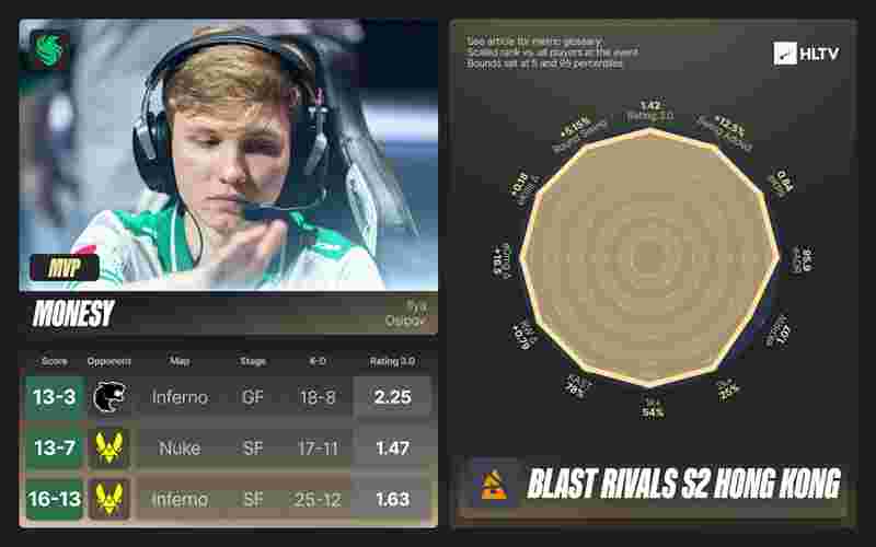 这位20岁的选手在赛季关键阶段状态爆发,过去三个月的线下赛rating位居所有选手之首。而此次香港赛事中,他的表现更是突破自身巅峰,rating高达1.42,每获胜回合击杀达1.16。