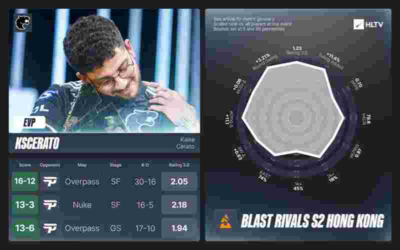 KSCERATO是FURIA战队在本次Rivals赛事中rating最高的选手(综合rating1.23,获胜地图rating1.35)。他在半决赛对阵paiN的比赛中主导战局,BO3 rating2.10,44回合内拿下46杀。