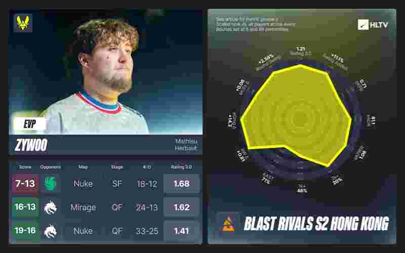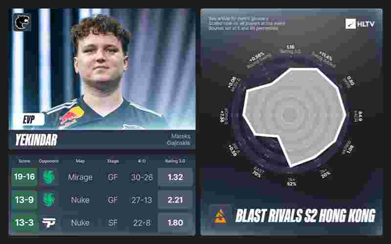 本次香港赛事为他带来了四连EVP,他在1/4决赛对阵Spirit的焦点战中表现出色(Nuke地图rating1.41,Mirage地图rating1.62),对阵Falcons时也展现出顽强对抗(BO3 rating1.36)。
