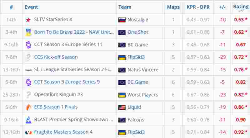 不过,这并非s1mple职业生涯中最糟糕的单次赛事表现。他个人Rating最低的赛事仍是StarLadder StarSeries X。当时,s1mple效力于Nostalgie临时战队,单张地图的Rating仅为0.53。