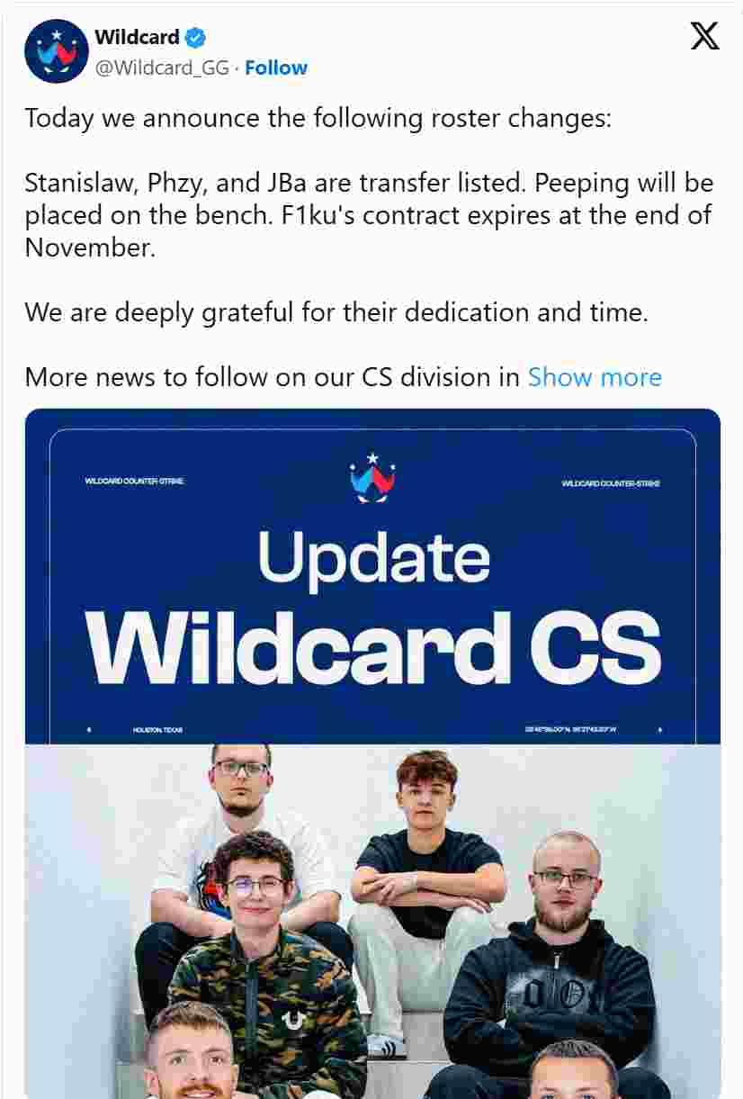 Wildcard已将stanislaw、JBa和phzy列入转会名单,将Peeping下放替补,并宣布将在F1KU11月底合同到期后与其解约。