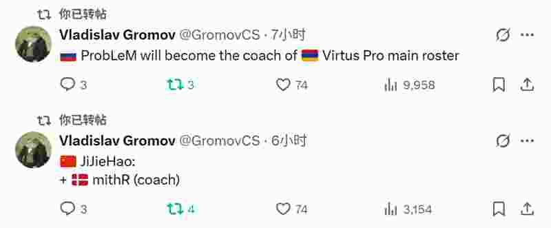 至于VP战队之前的教练F_1N则主动辞职,Gromov透露ProbLeM会成为队伍的新教练。后者现年27岁,是