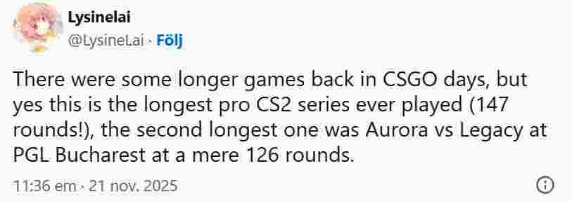 甚至,这可能是CS2历史上最曲折的一场比赛。这场总计打满147回合的较量,被认为是CS2历史上耗时最长的比赛。
