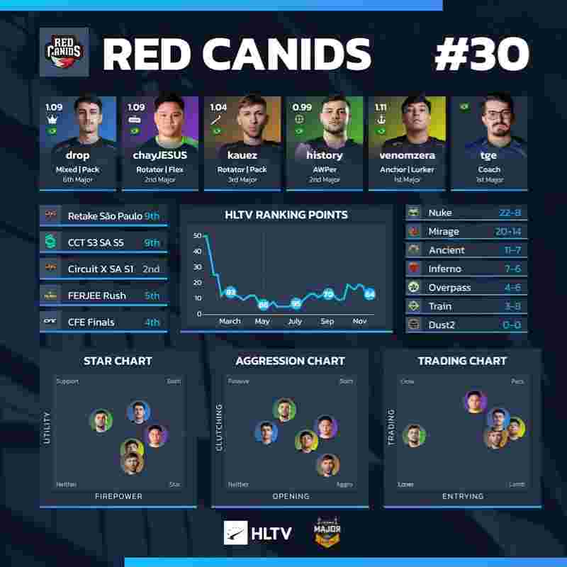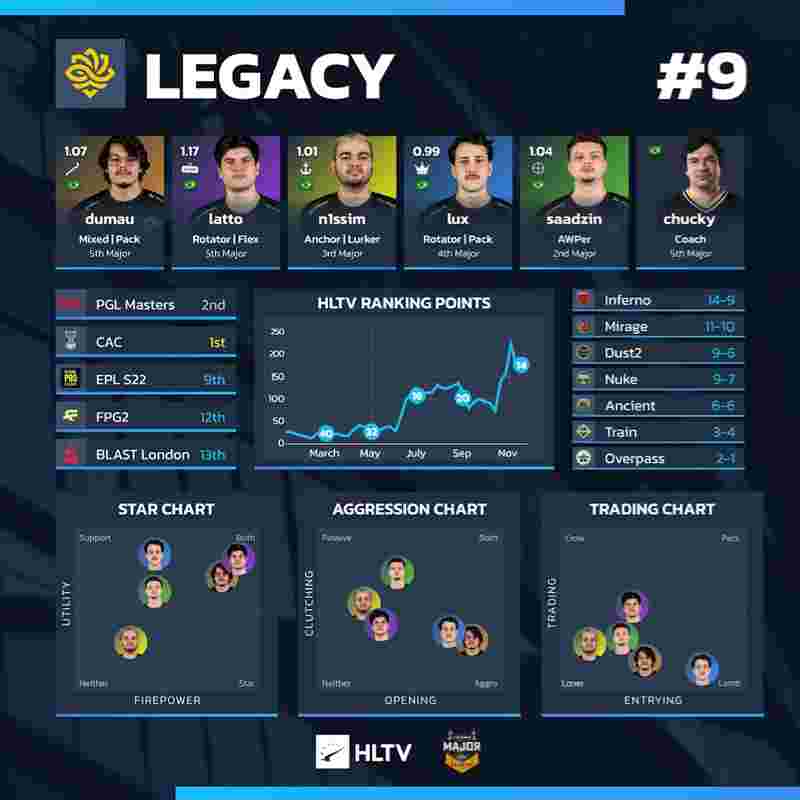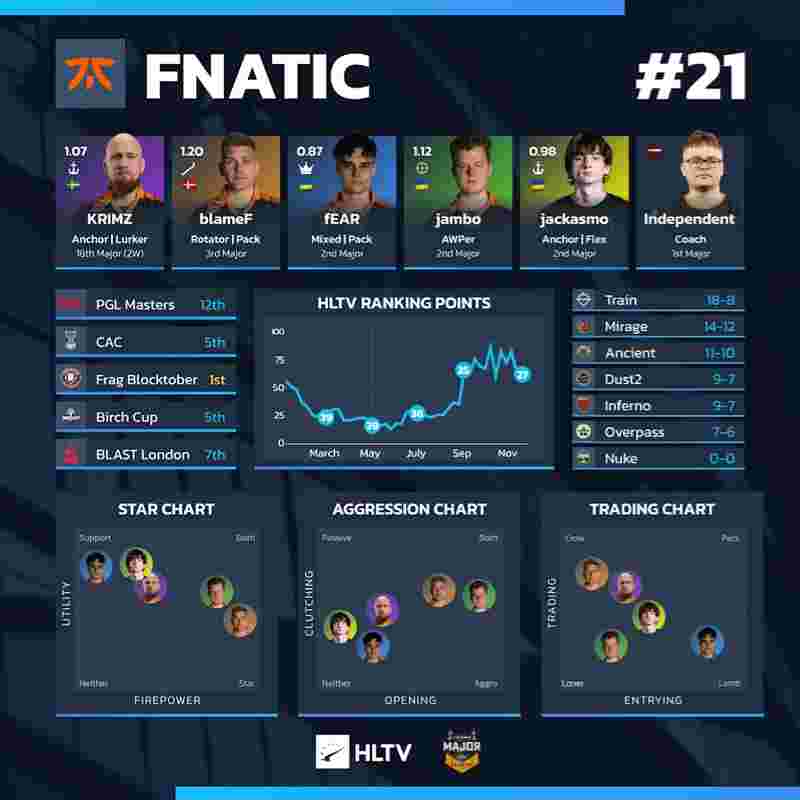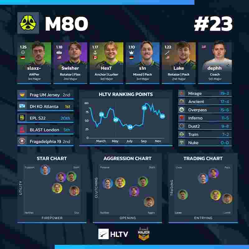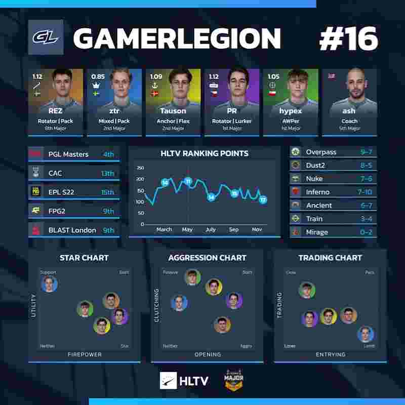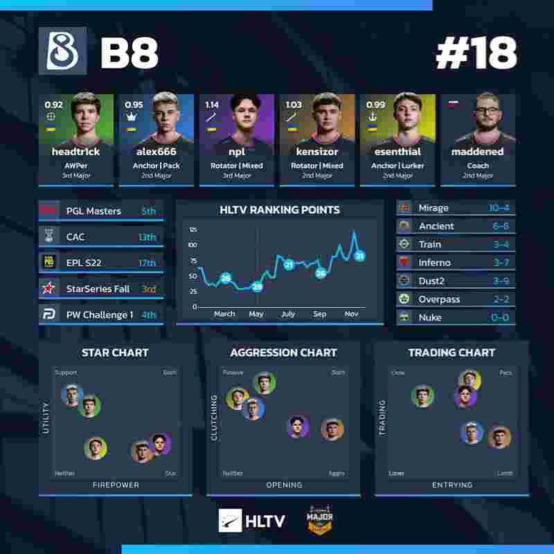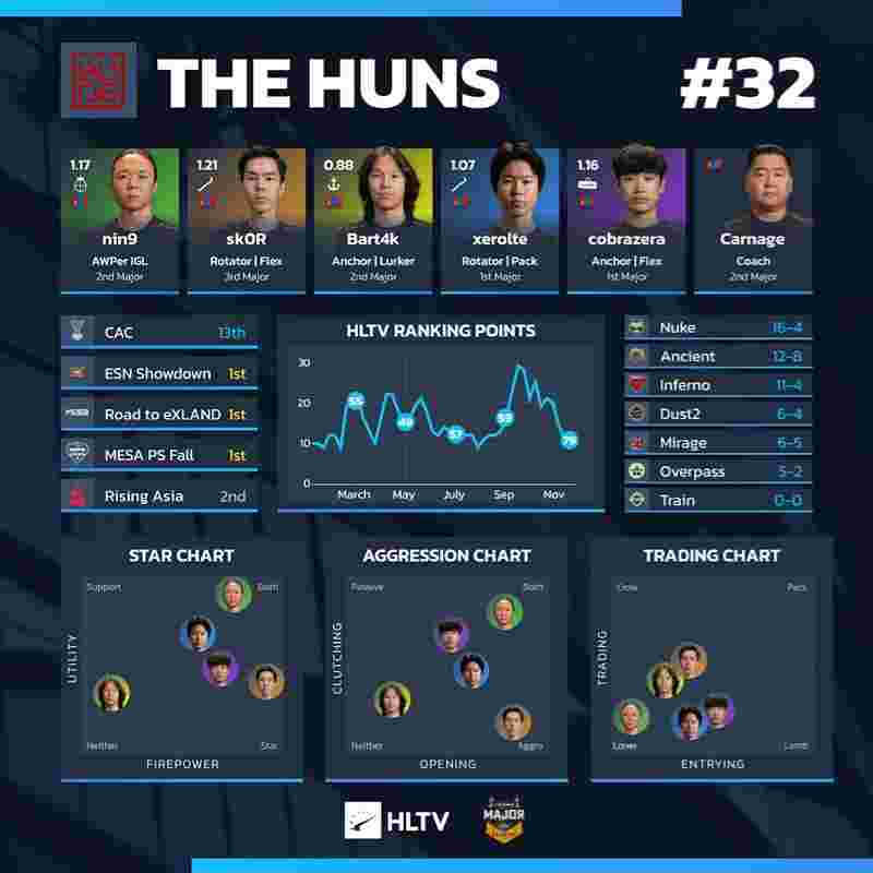首先,右上角的数字是该队伍的HLTV实力排名,该排名由撰稿人根据Major所有32支参赛队伍的表现主观评定得出。