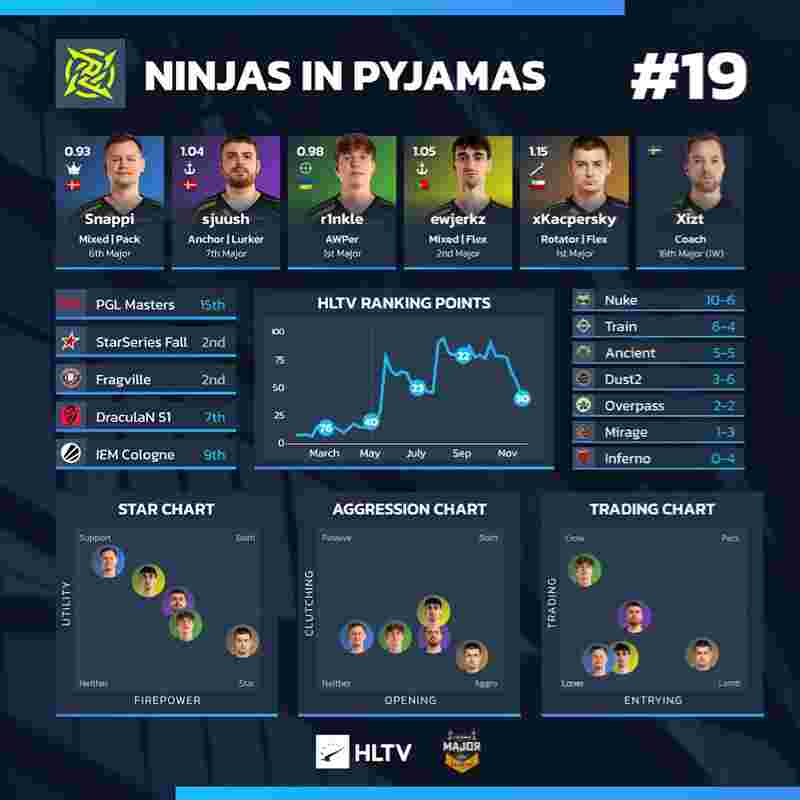 事实:NRG本赛季赢得了5项本土赛事冠军(CCT S3 S1、ECL Cup 1、Fragville、Revival S10、Fragadelphia UMJ),在决赛中击败过M80、Ninjas in Pyjamas等队伍,但本次Major将由daps替代nitr0参赛。