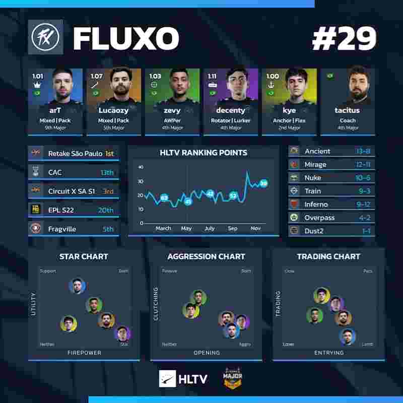 事实:FaZe已连续4届Major打入淘汰赛(自IEM里约Major后从未缺席),但目前HLTV排名仅第13位,这是2021年7月阵容重组以来的最低排名。