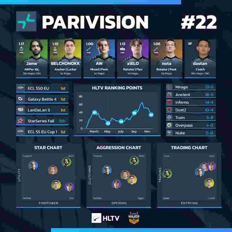 事实:PARIVISION的四名步枪手均为Major新秀,其中三人曾入选HLTV新秀榜前50名;仅BELCHONOKK因资历过深而未入选。