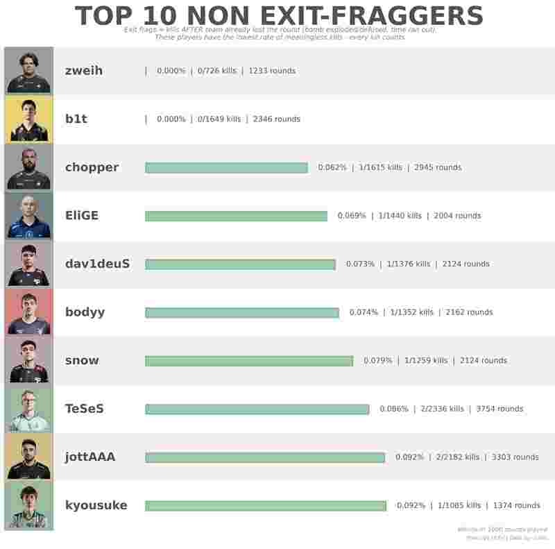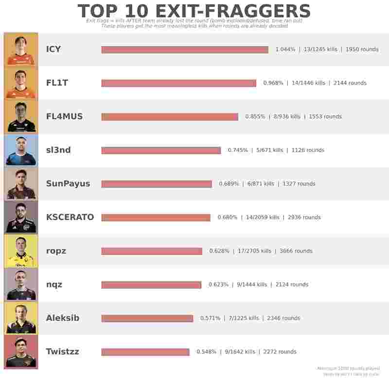 CS2分析师clu0ki针对职业赛场一项特殊数据指标展开研究:他统计了职业选手最少1000回合的“回合结束后击杀”(exit frags)数量。
