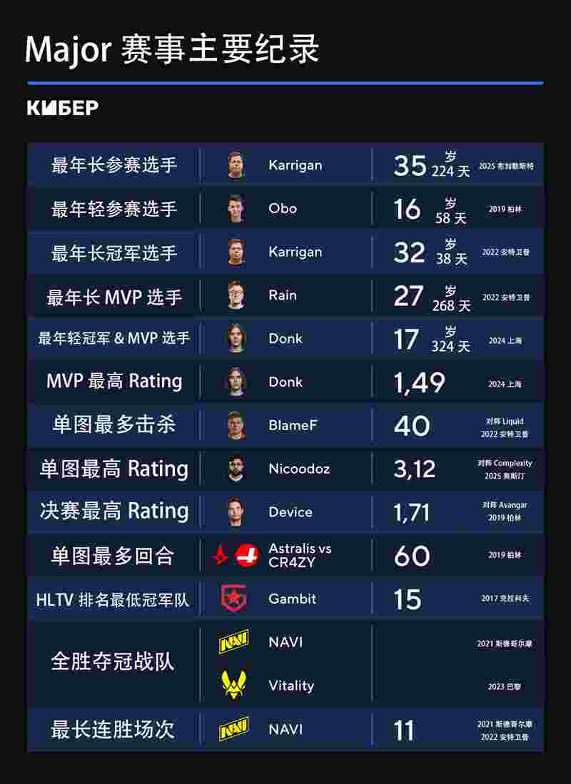 Major历史上最年长的参赛选手是karrigan。本届布达佩斯Major开赛时,他已35岁224天。他同时也是Major历史上最年长的冠军:在安特卫普Major夺冠时,他32岁38天,这一纪录此前由Zeus保持。不过Zeus拥有另一项独家纪录:他曾连续4年闯入Major决赛(2015年克卢日-纳波卡Major、2016年哥伦布Major、2017年克拉科夫Major、2018年伦敦Major),且这四次决赛分别是与三支不同的队伍一同闯入。