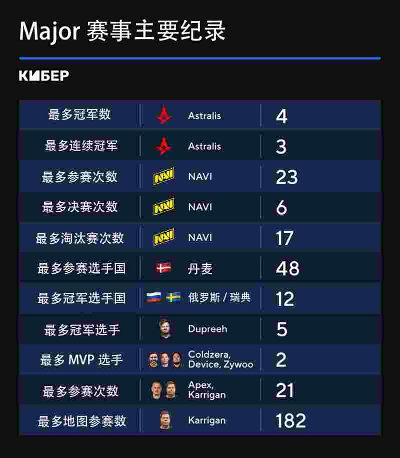 Ninjas in Pyjamas是Major决赛失利次数最多的战队,各有4次。但另一方面,NAVI仍是Major历史上最稳定的俱乐部:他们从未缺席任何一届Major赛事,且晋级淘汰赛的次数远超其他队伍,共17次。不过在过去4届Major中,他们战队有2次未能闯入淘汰赛阶段。