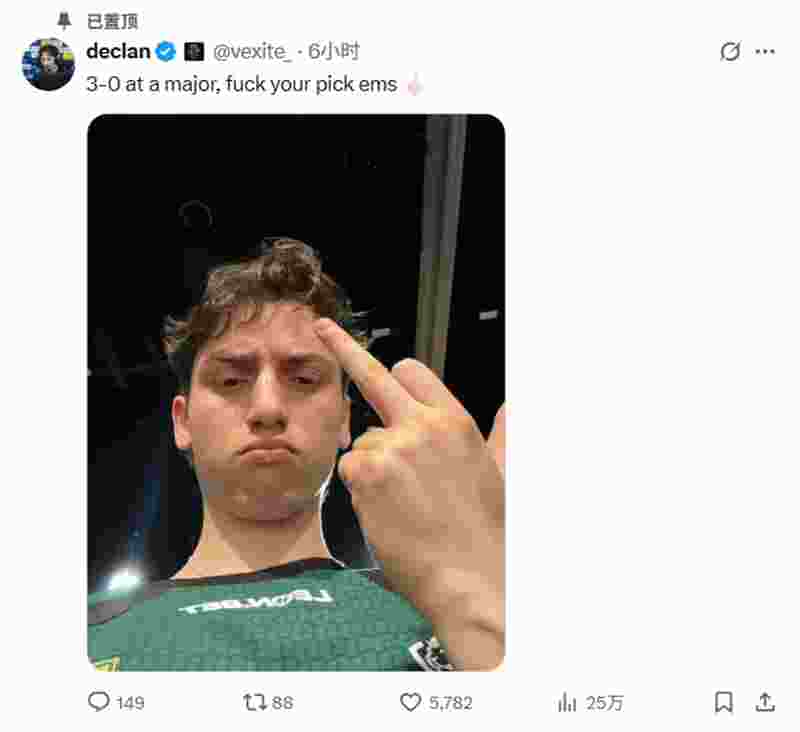 而在队伍晋级之后,FlyQuest战队选手Vexite在社交平台上发出了经典的“中指”手势,表达了对社区看衰他们的回应。