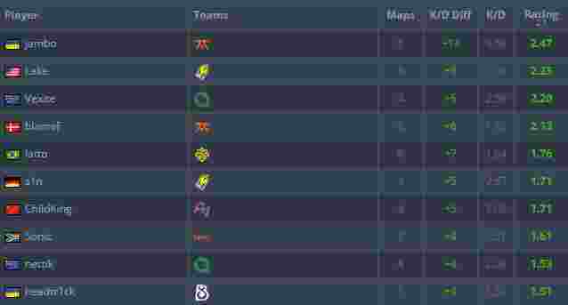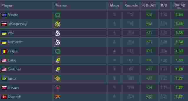 来自NiP的xKacpersky以1.46的rating排名第二,B8双雄npl和kensizor则以0.01 rating差位居3-4名。一路扛着FaZe杀入第二阶段的frozen也成功跻身TOP10之中,而最后一位TOP10则是由公认的“数据超人”blameF占有。