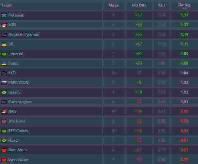 毫无疑问前八名战队都进入了第二阶段,并且表现亮眼的FlyQuest全队以1.31 rating成功登顶。而第一阶段焦点队伍FaZe却以1.04 rating排在第七,不得不让人担忧他们能否在强度更高的第二阶段突出重围。两支中国战队