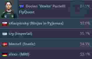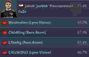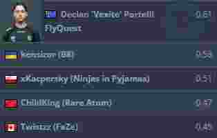 Vexite依旧在此榜单中领衔,排名第二的是来自B8的kensizor。ChildKing以每回合0.47的爆头率排名第四,第五位则是“发型总监”Twistzz。