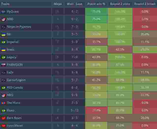 MR12的赛制下,能赢得手枪局的队伍不论在比分、经济还是心态上都可以获得相当客观的优势。图表中不难看出手枪局胜率高的队伍普遍更容易拿下比赛。