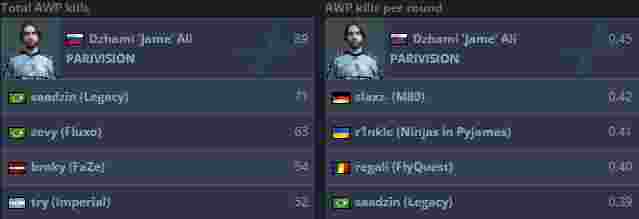 两份榜单都由PARIVISION的主狙Jame领衔。值得注意的是,broky虽然狙杀数排名第四,但到了右边的回合狙杀榜,却消失在了前五名(最终排名第十一)。可见他之所以能凭总数上榜全靠“多劳多得”。