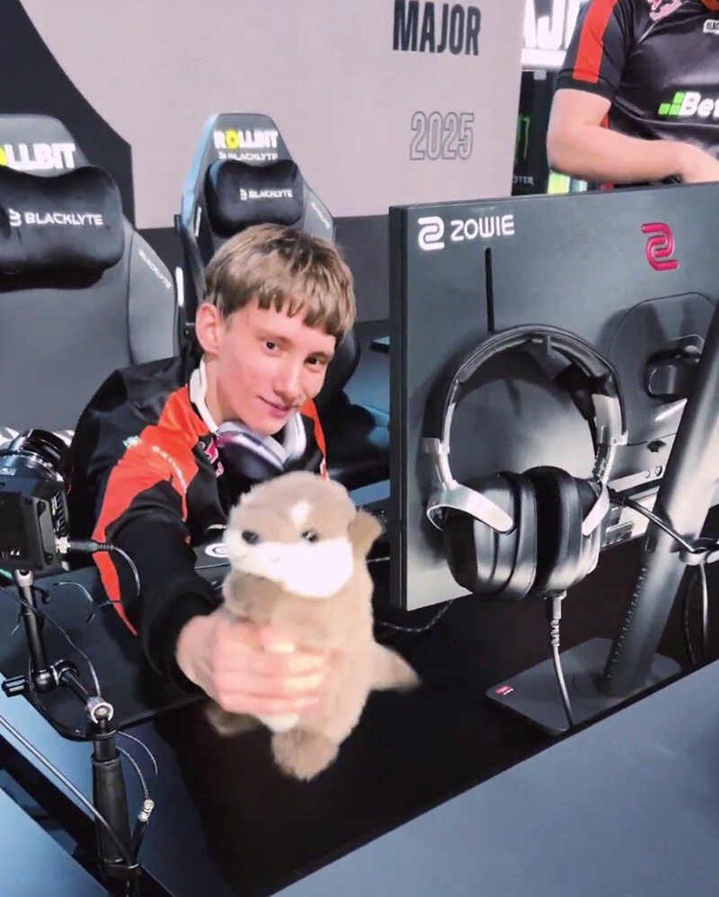 PARIVISION战队的BELCHONOKK在比赛桌上放了一只毛绒松鼠。