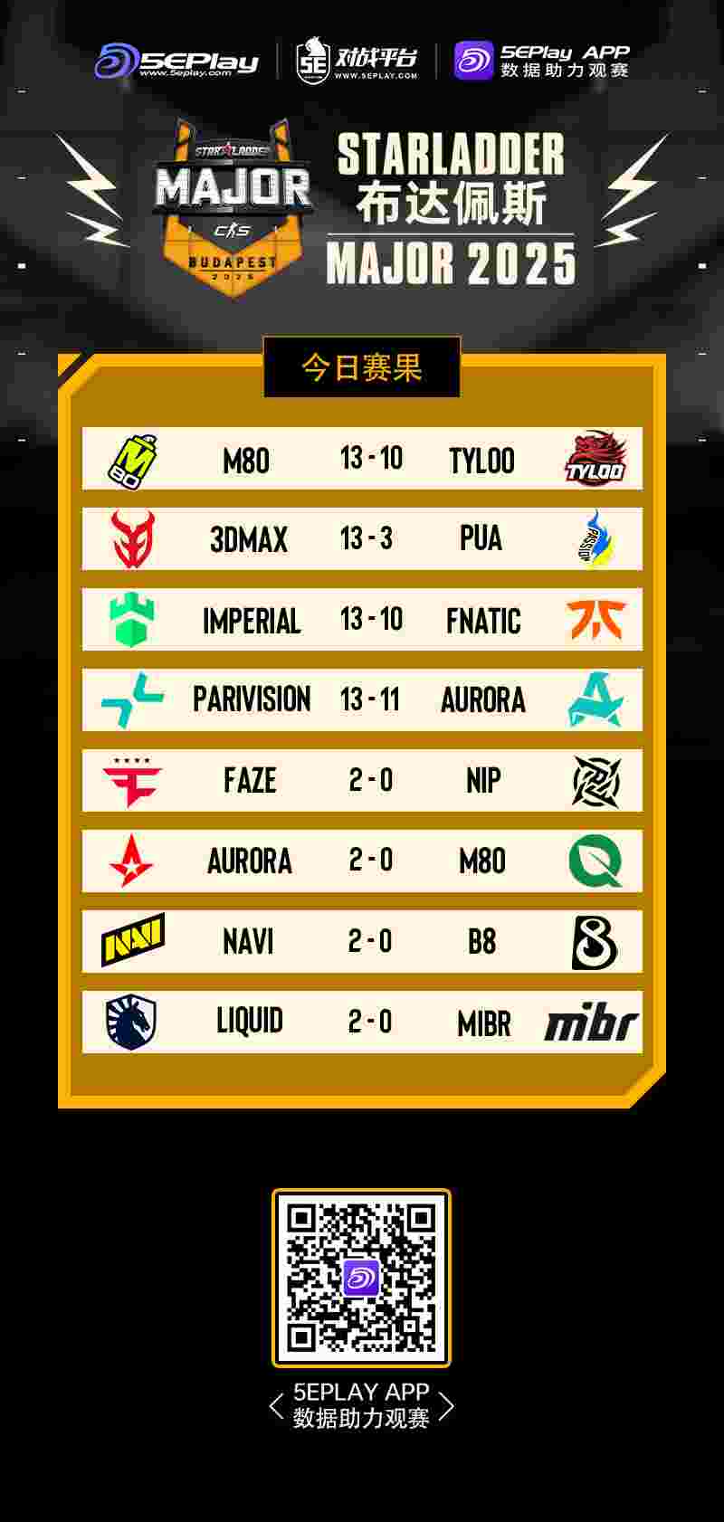 布达佩斯Major第二阶段第二日于今日22:00正式开赛。FaZe、NAVI将开启3-0晋级门票争夺战,Liquid、Astralis首日掉入0-2小组也将面临回家局,TYLOO进入1-1小组面对强敌M80。本文将实时更新今日各场次战果。