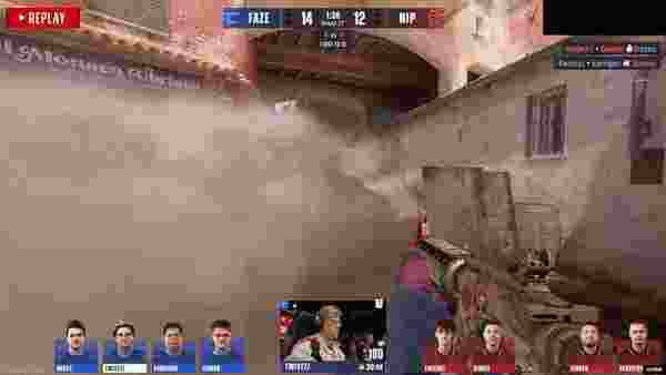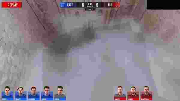 FaZe先做进攻方。手枪局,jcobbb锅炉房默认过程看到两人套餐被秒让队友转B,想放雷包的broky由于警家烟散被打死,队友阵型大劣,r1nkle和sjuush双人四杀拿下手枪局。