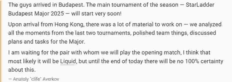 “队员们已抵达布达佩斯,我们在本赛季核心赛事StarLadder布达佩斯Major的征程也将拉开帷幕。
