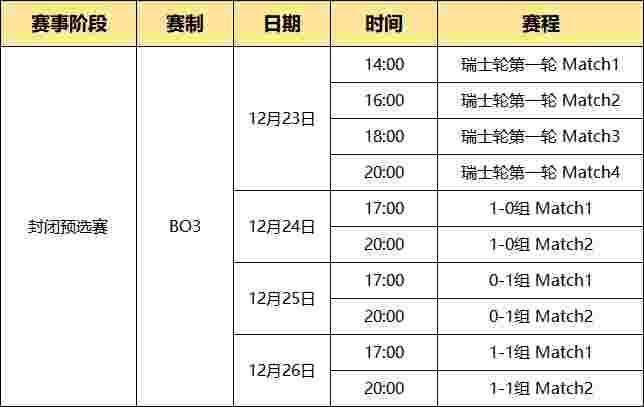 ○ 【封闭预选赛】:通过瑞士轮(BO3),最终4支队伍晋级下一阶段。