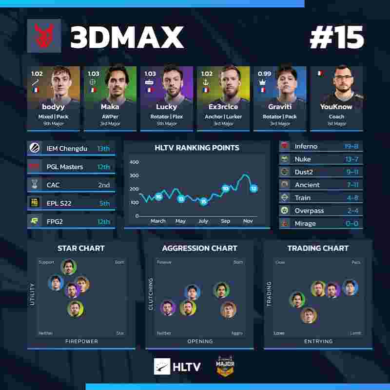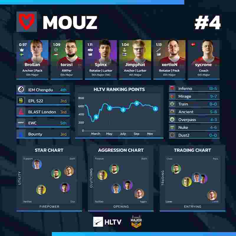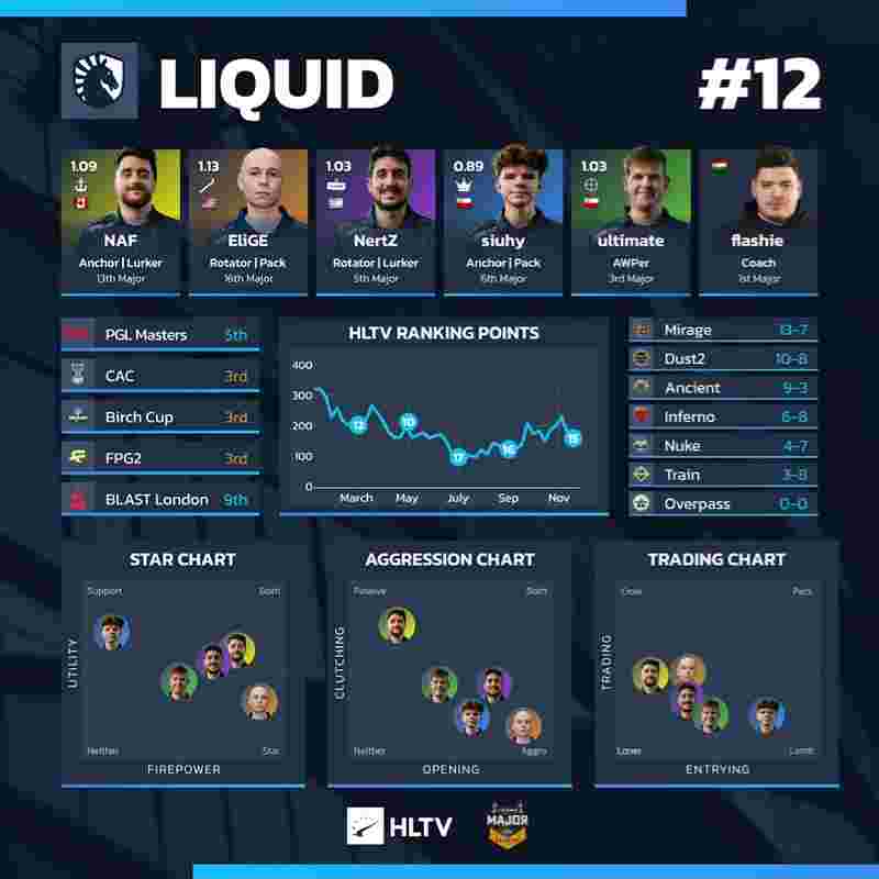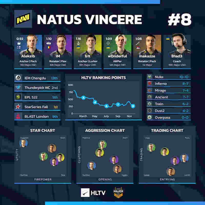 Astralis(当时排名第14)。在对阵Top 20队伍的22场比赛中,他们仅赢下9场(胜率41%);而对阵Top 10队伍时,更是0胜8负。