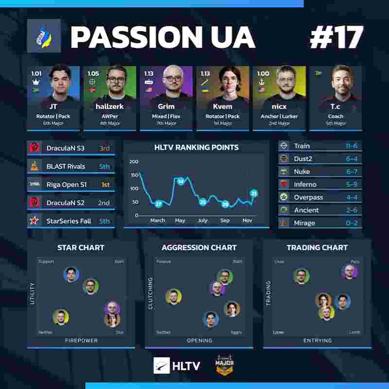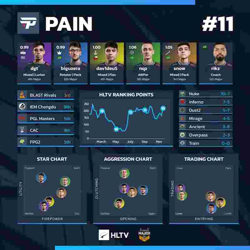 paiN的击杀交换率低得惊人,仅为18.7%,是所有32支Major参赛队伍中最低的;同时,他们本赛季每回合闪光助攻数也排名垫底,仅为0.18。