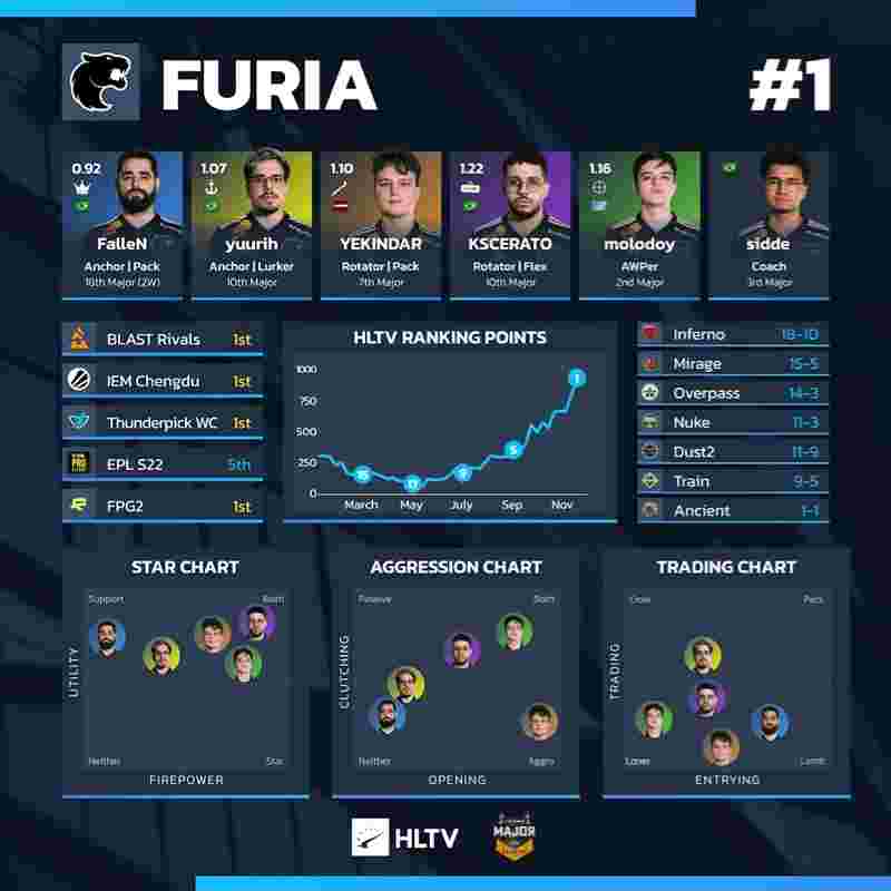 据用户btrams统计,FURIA本赛季胶着对局(指比分接近的关键比赛)胜率超过70%,这一数据印证了他们的关键局基因,正是凭借这份能力,他们已连续斩获三站赛事冠军。