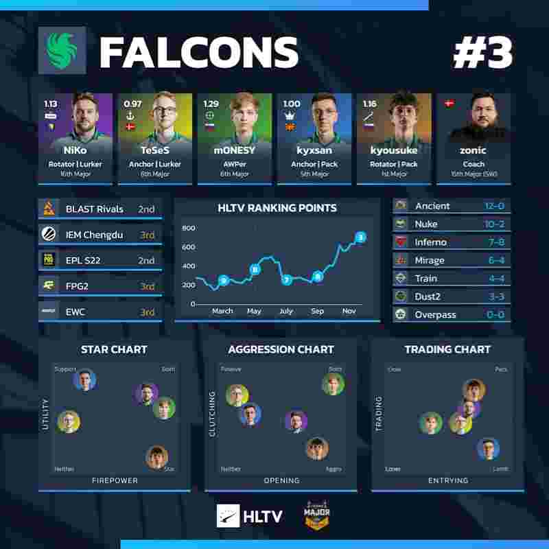 m0NESY状态回归巅峰,本赛季Rating达1.29,进攻方Rating更是高达1.38,这两项数据均仅次于donk,位列世界第二。在Falcons本赛季保持全胜(12胜0负)的Ancient地图上,m0NESY的平均Rating高达1.42。