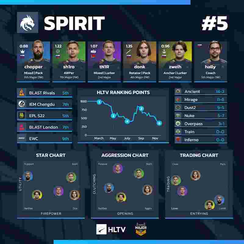 Spirit在本赛季初曾连夺IEM科隆站与赏金赛赛事冠军,但此后连续五站赛事均未能打进半决赛,陷入状态低谷。
