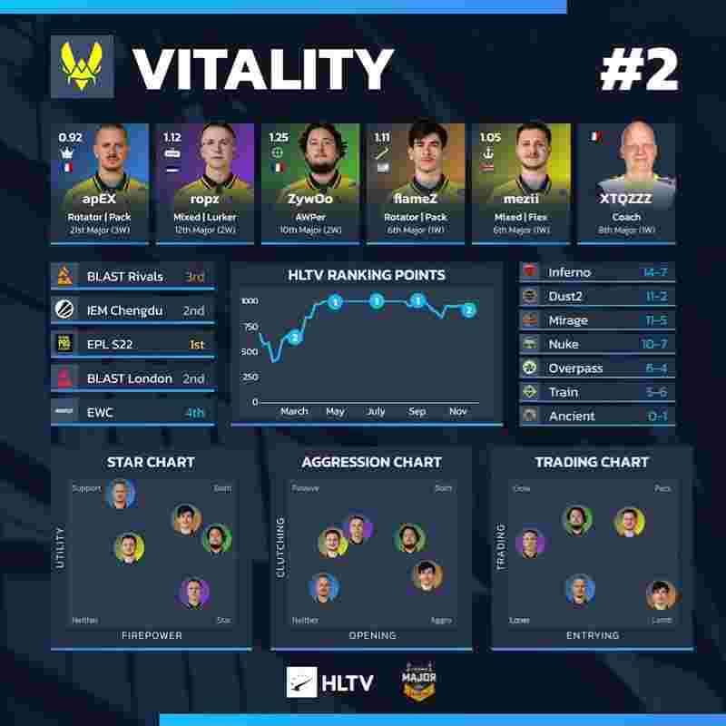 Vitality本赛季有32周位居HLTV排名榜首(占全年66.7%),其中19周更是以满分1000分的排名积分稳居第一。同时,他们还保持着连续14站赛事跻身四强的纪录。