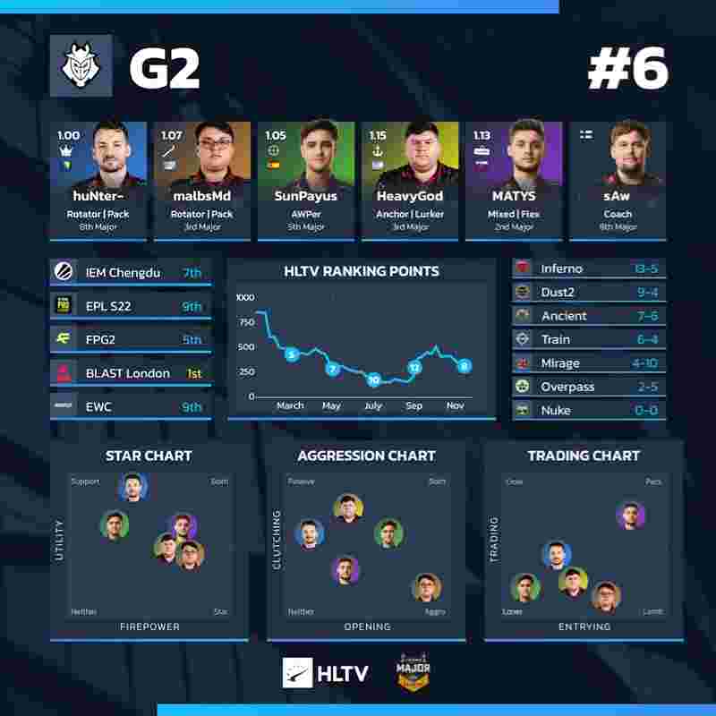 G2的地图池短板问题明显:过去8场Mirage地图的比赛中输了7场;而对于huNter-常ban的Overpass地图,他们的战绩仅为2胜5负。有趣的是,队伍表现最好的地图竟是sAw与SunPayus过去常ban的Inferno,战绩为13胜5负。